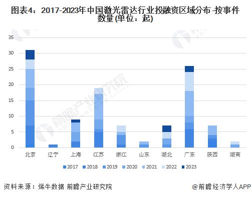 从激光雷达行业的企业融资区域来看,目前北京的融资事件最多,2017-2023 年累计达到 31 起,其中 2019 年累计达 8 起。同时,上海、广东、江苏等地的激光雷达投融资活跃度也较高。