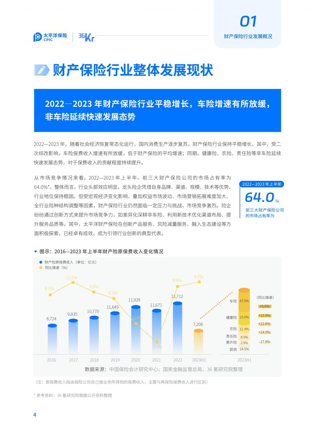 2022 — 2023 年,随着社会 经济 恢复常态化运行,国内消费生产逐步复苏,财产保险行业保持平稳增长。整体而言,财产保险行业头部效应明显,龙头险企凭借自身品牌、渠道、规模、技术等优势,行业地位保持稳固。但受宏观经济变化影响,叠加权益市场波动、市场 营销 拓展难度加大、全行业险种结构调整等因素,财产保险行业仍然面临一定压力与挑战,市场竞争激烈,险企纷纷通过创新方式来提升市场竞争力。