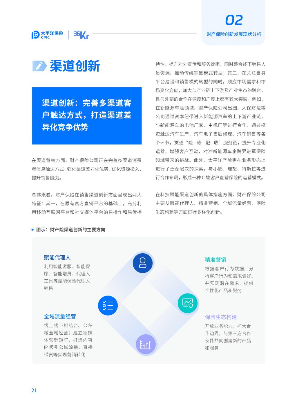 渠道创新呈现两大特征:其一,利用 社交 媒体 平台提升宣传和服务效率;其二,加大与产业链上下游及产业生态的合作,扩大渠道触达。具体创新方法表现为保险科技赋能代理人、精准营销、全域流量经营、保险生态构建等。