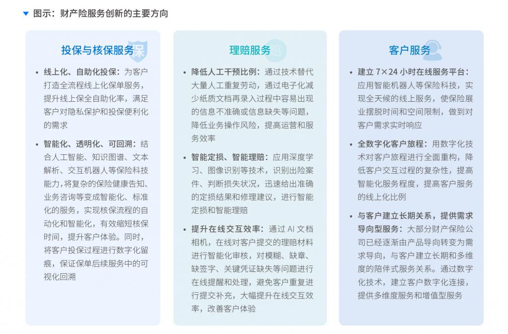 财产保险公司主要在技术、产品、服务、渠道、模式、管理等六个方面进行创新升级