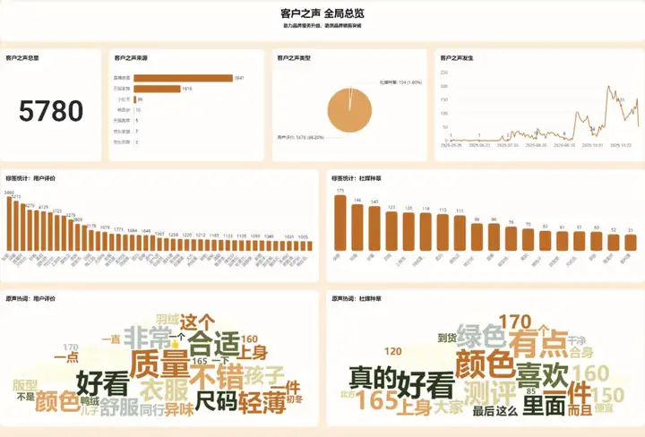 更贴心的是,系统预设了专为电商打造的标签分析体系,自动将反馈分类为商品质量、物流问题、活动规则等维度,还能生成不同部门需要的报表,给商品部的是质量问题分析,给物流部的是配送时效统计,给客服的是话术以及情绪分析建议。