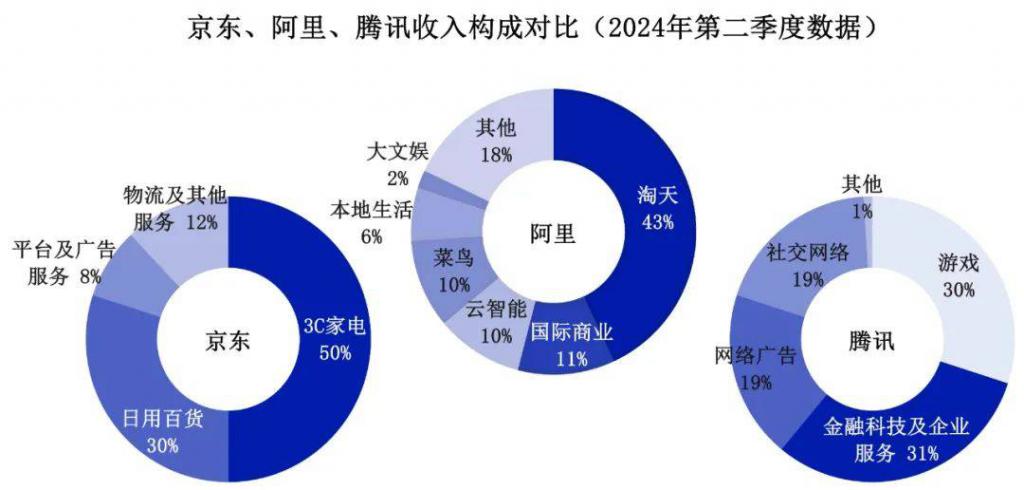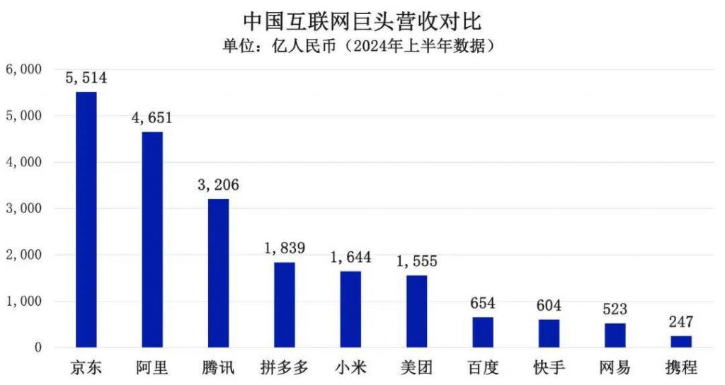 2024 年上半年, 营收超过 3000 亿人民币的巨头有三家:京东、阿里、腾讯。