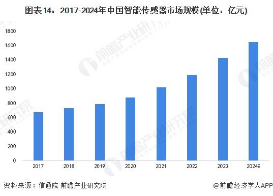 经过二十余年的发展我国智能传感器产业已进入稳健成长期,成为了一个超过千亿人民币市场规模的巨大产业,根据信通院的数据,2023 年中国智能传感器市场规模达到 1429.6 亿元,初步统计到 2024 年突破 1600 亿元。