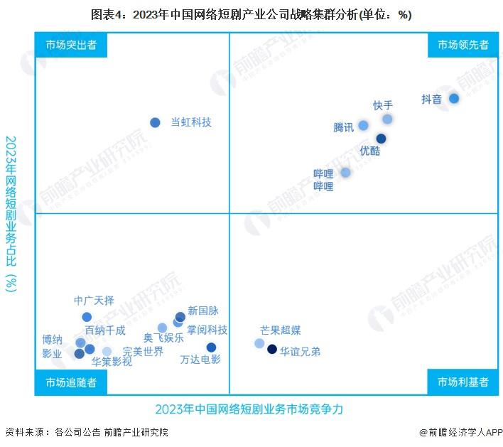 根据 2023 年公司业绩、公司制作产品、网络短剧上线部署等情况进行市场竞争集群分析了解到,目前大部分企业业务较小,尤其是产业链中上游的 IP 版权、内容创作、影视制作等规模较小,竞争力相对较弱,处于市场追随者状态,当虹科技由于影视技术先进,主要服务于网路短剧处于市场突出者。市场领先者是各大视频平台,例如抖音快手、爱优腾、哔哩哔哩等,芒果超媒、华谊兄弟等市场规模相对较大,布局网络短剧资源较好,但是主要还是扎根电视剧和电影等长剧集,对网络短剧的业务兴趣较低。