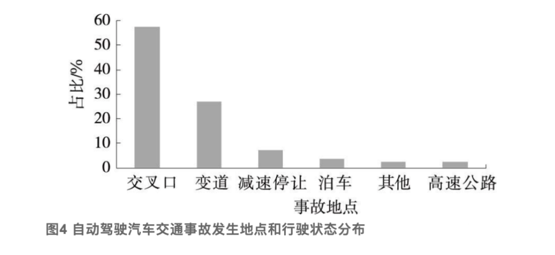 自动驾驶汽车交通事故主要发生在城市道路上,占总数的95%,城市道路上自动驾驶汽车事故中,发生在交叉口、变道和减速转弯的事故率分别为57%、27%和7%。
