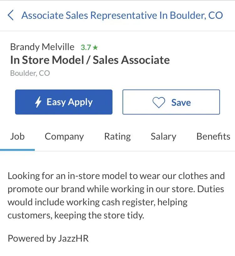 这些女孩是门店的店员。据了解,BM雇佣的店员很多都是签约经纪公司的模特。它在招募店员时,就清楚地写着要求—Model。7月17号就有一场模特试镜在上海长乐路764号的房子里进行过。在BM其他门店,也是如此。