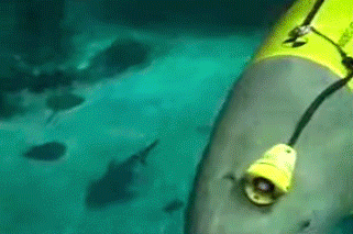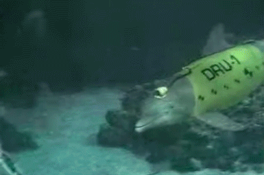 当时的机器海豚,身上甚至还连着一根长长的控制线,但已经可以在池子里游泳并与潜水员互动。