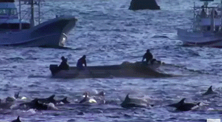每年9月到来年4月,太地町附近海域都有迁徙的海豚经过,渔民们将此视作天赐礼物,他们开着船,成群结队等待海豚到来,然后将它们驱赶向海岸圈起来。